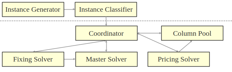 The main module of the solver is the coordinator: It instructs the behaviour of the remaining modules, observes if a terminating solution has been found or if time-limits have been exceeded. Following the column generation approach, the constraints of the instance are split into local- and global constraints, respectively. The master solver hosts the global constraints and always solves some given linear program. The corresponding dual solution yields reduced cost coefficients on the edges, which are reported to the pricing solver by the coordinator. The pricing solver solves the subproblem, which is given by the graph, the local singleton constraints, and the vertex-balances. In many cases, these problems are simply SHORTEST PATH problems of some variety (and determined by the instance classifier). The pricing solver is responsible for most of the speed and scalability of our approach: SHORTEST PATH can be solved in low order polynomial time and a large number of paths can be generated in parallel. The paths are reported to the column pool, deciding which ones to keep and which ones to discard. The remaining columns are finally added to the linear program to be solved by the master solver. Finally, the fixing solver decides which variables or constraints in the linear program are rounded, frozen, or released.